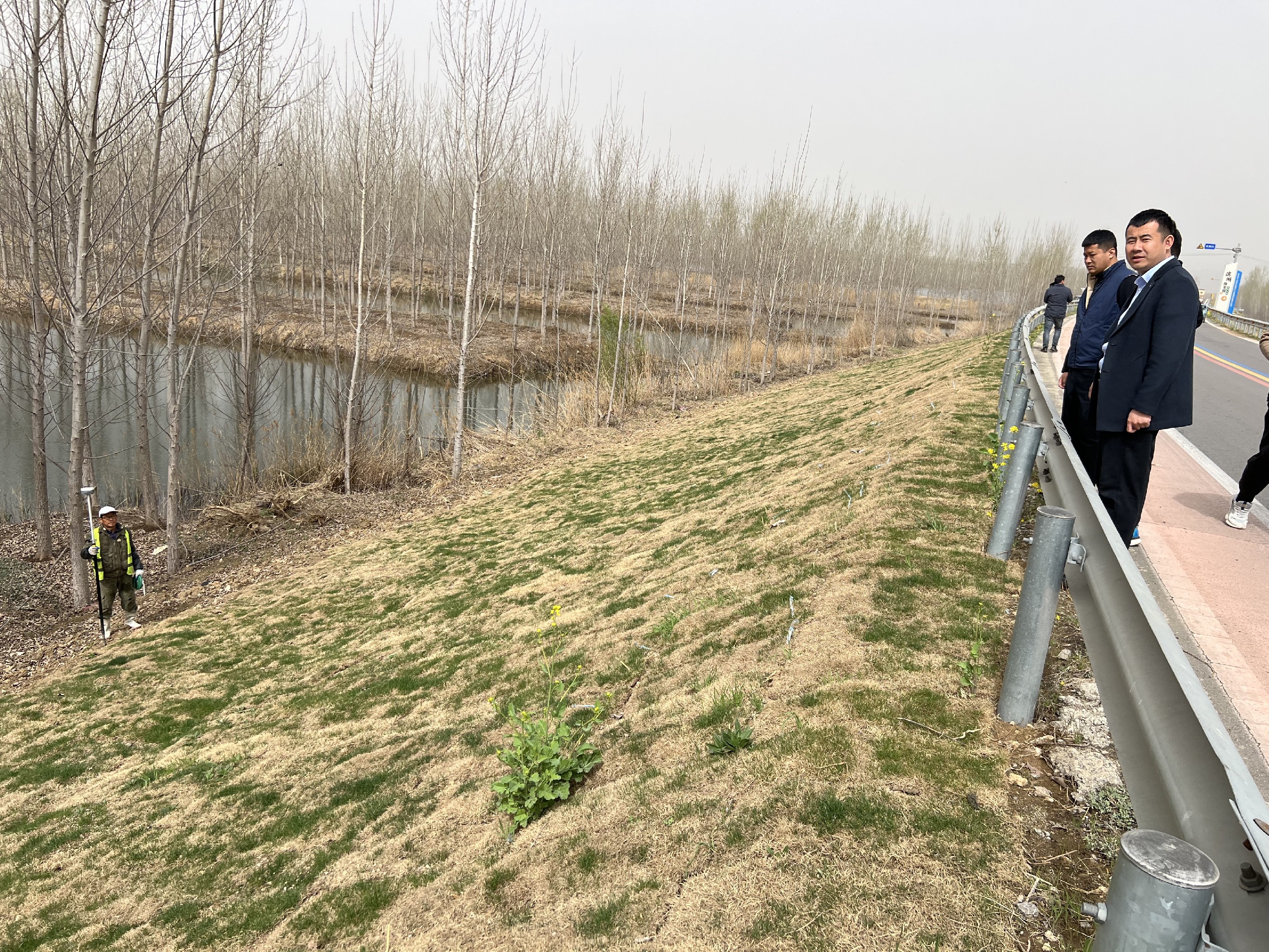 查看湖東堤維保工程草皮養護情況。